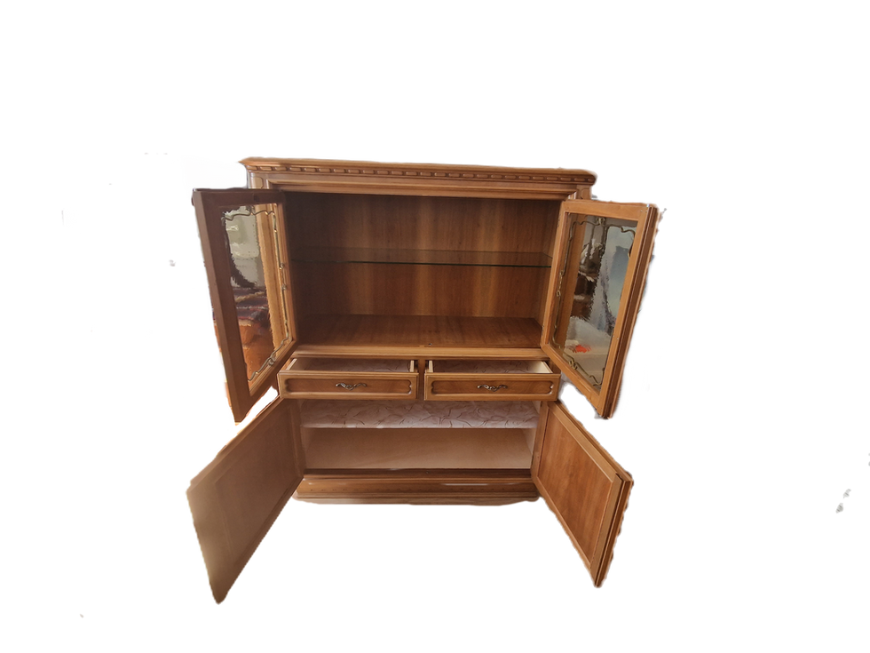 Stilvoller Vitrinenschrank aus schön gemasertem Holzdekor. Mit seiner verzierten Glasfront, den dekorativen Fräsungen und dem warmen Farbton eignet sich das Möbel perfekt für Wohnzimmer, Esszimmer oder den Eingangsbereich. Er bietet reichlich Platz für Geschirr, Dekoration, Gläser oder Sammlerstücke.
